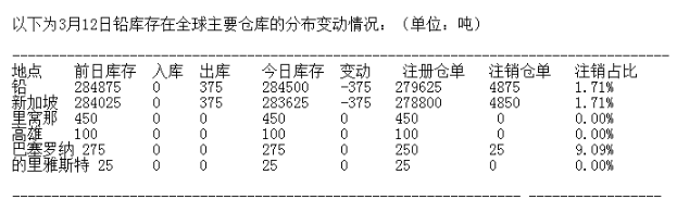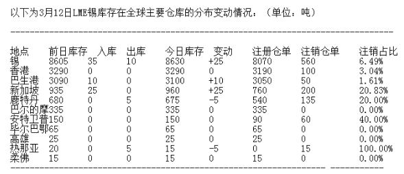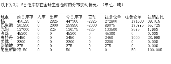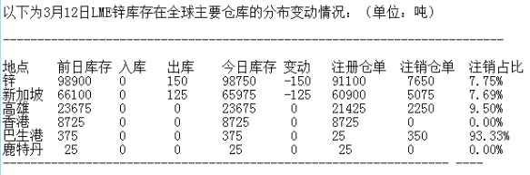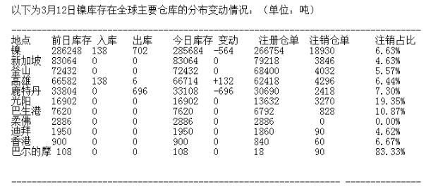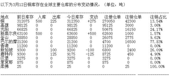 ?LME 3月12日有色金屬庫(kù)存分布情況