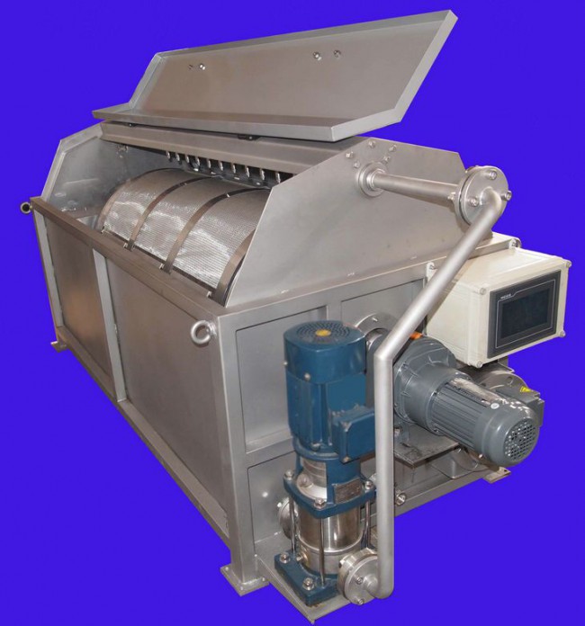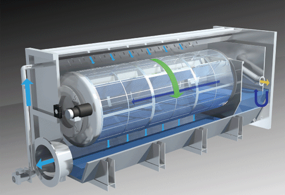 裝置由設(shè)備結(jié)構(gòu)模塊、過(guò)濾模塊、驅(qū)動(dòng)系統(tǒng)、反沖洗系統(tǒng)、自控系統(tǒng)組成。污水流入空心轉(zhuǎn)鼓內(nèi),由于重力的作用由濾網(wǎng)內(nèi)側(cè)向外側(cè)流出,水中的懸浮物被截留在不銹鋼濾網(wǎng)內(nèi)側(cè)。轉(zhuǎn)鼓緩緩轉(zhuǎn)動(dòng),反沖洗泵抽取濾后出水對(duì)網(wǎng)進(jìn)行反沖洗。沖洗水通過(guò)位于轉(zhuǎn)鼓頂部的噴頭由濾網(wǎng)外側(cè)向內(nèi)側(cè)對(duì)濾網(wǎng)進(jìn)行沖洗,沖洗下來(lái)的顆粒物質(zhì)由反沖洗水收集槽收集,并通過(guò)排污管排出設(shè)備。