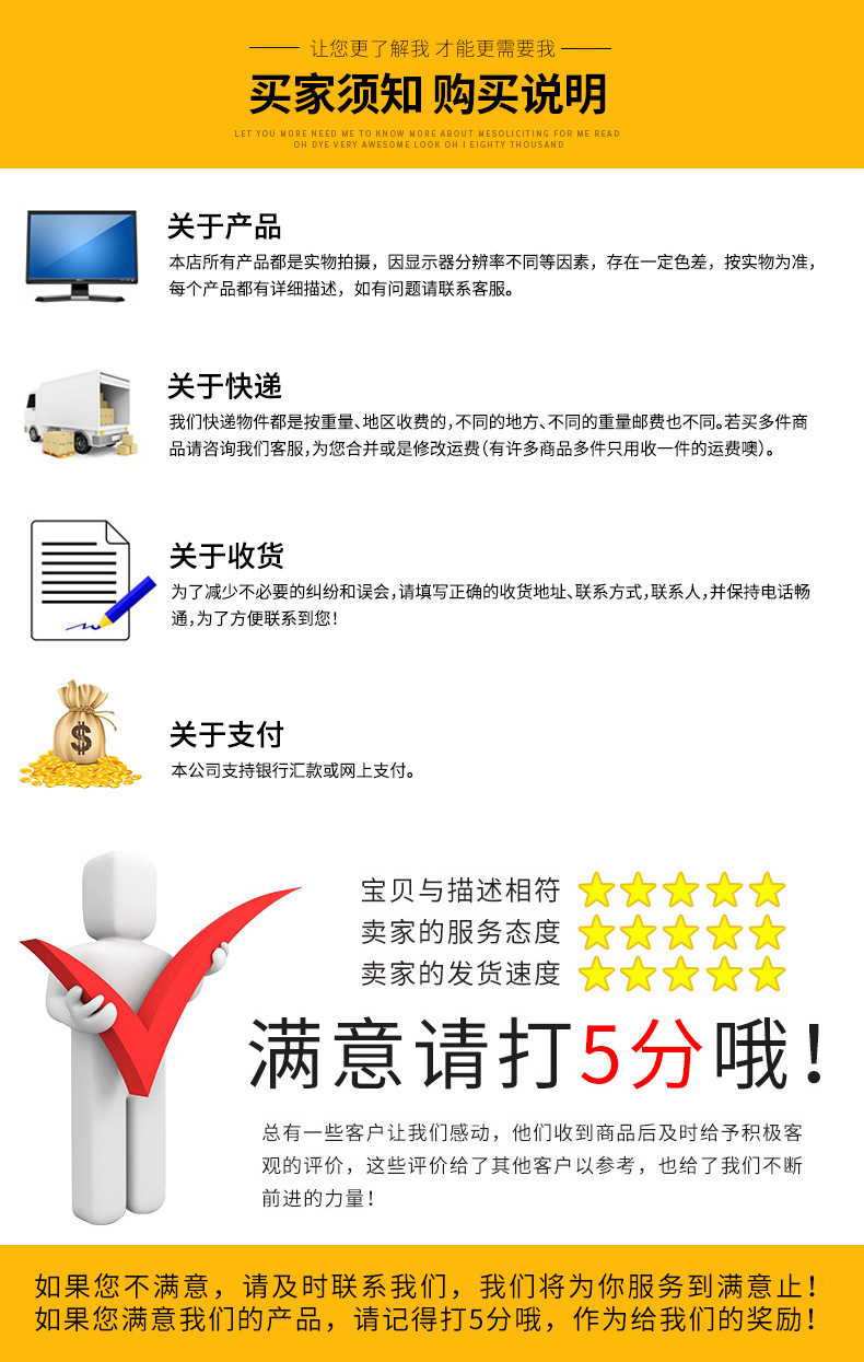 1、關(guān)于產(chǎn)品質(zhì)量:網(wǎng)絡(luò)交易,誠信為王。作為淘寶店鋪的戰(zhàn)略合作伙伴,我們對產(chǎn)品的要求和把控極其嚴 格,所有的產(chǎn)品在出貨前均會經(jīng)過采購、QC、倉管相關(guān)人員的三次質(zhì)檢,確保發(fā)貨到您手里的產(chǎn)品是合格產(chǎn)品,萬一產(chǎn)品有質(zhì)量問題(貨流量大,疏漏在所難免,在此深表歉意),請?zhí)峁﹫D片證據(jù),并在48小時內(nèi)反饋。
