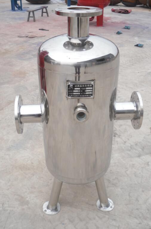 當(dāng)自來(lái)水通過(guò)導(dǎo)流管進(jìn)入第一道濾網(wǎng)底部后,固體硅磷晶顆粒被放在濾網(wǎng)上部,而自來(lái)水的水流通過(guò)濾網(wǎng)、硅磷晶球體,由過(guò)帶有第貳道濾網(wǎng)的出口排出。當(dāng)需要清洗時(shí),關(guān)閉進(jìn)出水口閥門(mén),打開(kāi)排污閥門(mén),排凈自來(lái)水,旋開(kāi)罐體上部螺塞,拆卸法蘭蓋,清洗后重新裝入即可。因此,使用維護(hù)極為方便。