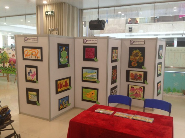展板的展示方式:1.可以用掛鉤或者掛線來展示作品,展板橫梁的頂部為”帶凹槽的扁鋁“,可掛各種金屬掛鉤,如上圖的畫面就是用S勾掛上去的。2.展板上粘貼物品方法:需用“透明膠或大力膠”打底之后再使用海綿膠粘貼廣告畫等。