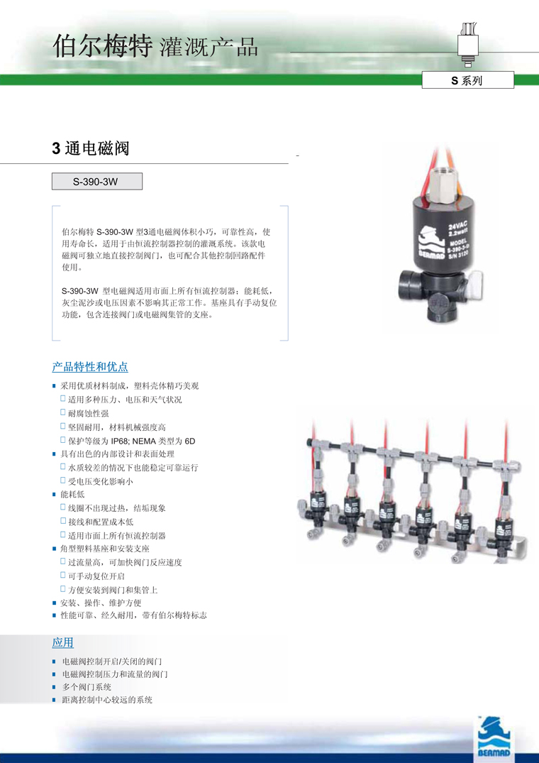 伯爾梅特 S-390-3W 型3通電磁閥體積小巧,可靠性高,使用壽命長,適用于由恒流控制器控制的灌溉系統(tǒng)。該款電磁閥可獨立地直接控制閥門,也可配合其他控制回路配件使用。