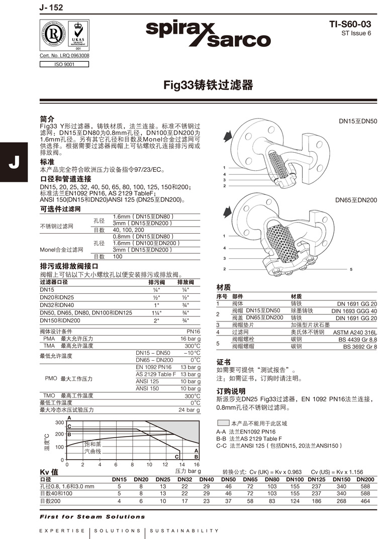 SpiraxSarco斯派莎克FIG33法蘭過濾器的技術(shù)參數(shù):